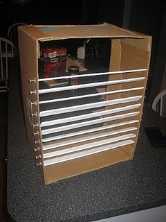 So for the last couple of weeks I’ve been trying to figure out exactly how to build my faux-louver door contraption. For the opening scene I need to simulate looking out of a louvered door, and the actual louvers on my closet door are too close together to actually see anything on the other side. So I got this brilliant idea to grab 10 (free) paint stirrers from Home Depot and paint them white. Then tonight I got the idea to use a cardboard box and pin them up with push-pins. That allows me to spin them to the exact angle I need to be able to see something. Check out the finished product: