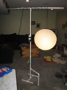 As my friend Ron tweeted the other day “pvc, tape and wd40… all the tools a man needs”, so it goes that I built myself a new light stand from PVC pipes.  Check out the picture with my Chinese lantern hanging off it…not bad for under $10!