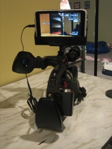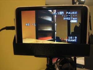 So I’ve got this guy (Jerry) I work with who can pretty much do anything you ask him to do.  We liken him to the Dos Equis guy (The Most Interesting Man In The World) since he’s done so much.  I knew he could build stuff, so I asked him to create a mount for my camera to hold this 7″ LCD TV that I bought as an external monitor.  He just gave me his second version of the mount, and let me tell you…it’s pretty damn sweet.  He actually bent, welded and spray painted this thing, and it looks and works like a charm.  Check out these pictures of it: